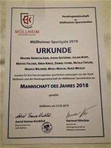 Bei den Erwachsenen wurde unsere 1. Mannschaft für den sofortigen Aufstieg und die Meisterschaft in der Kreisliga B geehrt. Gewürdigt wurden insbesondere die Anstrengungen, die unser Verein unternommen hat, um nach jahrelanger Abstinenz vom Ligageschäft, wieder eine schlagkräftige Truppe zusammenzustellen. Unseren Verein würdig vertreten haben Jannik Heim, Jannik Weber, Fabian Gramelspacher, Bastian Kiefer, David Heuberger, Yannick Sulz, Mario Danzeisen, Max Kiefer sowie die Trainer Erkan Egin und Benedikt Merkel.